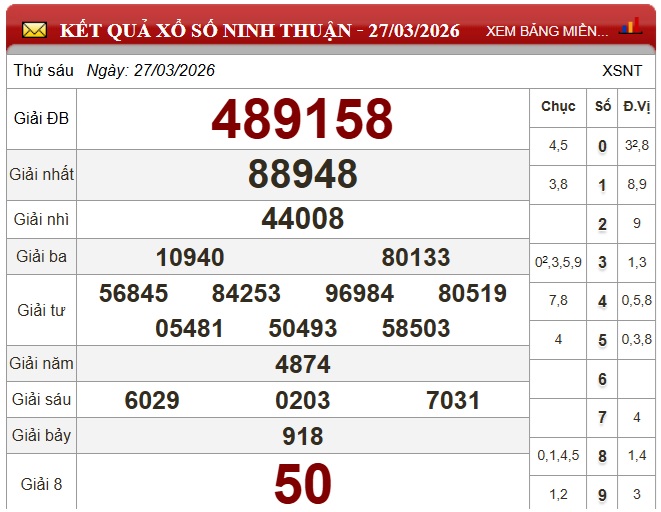 Kết quả xổ số Ninh Thuận ngày 27/3/2026