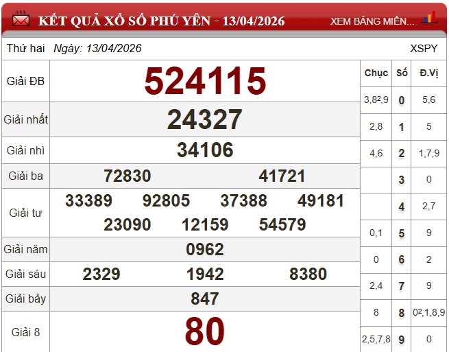 Kết quả xổ số Phú Yên ngày 13/4/2026
