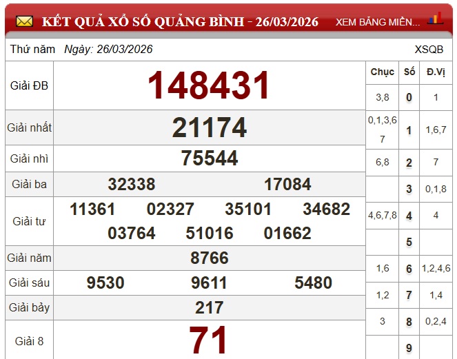 Kết quả xổ số Quảng Bình ngày 26/3/2026