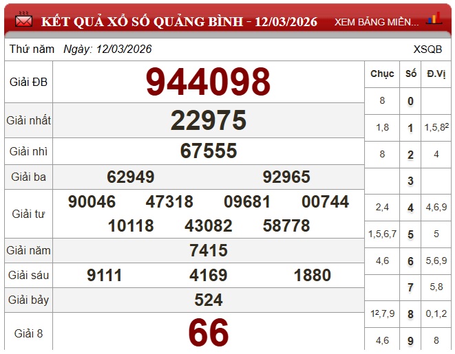 Kết quả xổ số Quảng Bình Thứ Năm ngày 12/3/2026