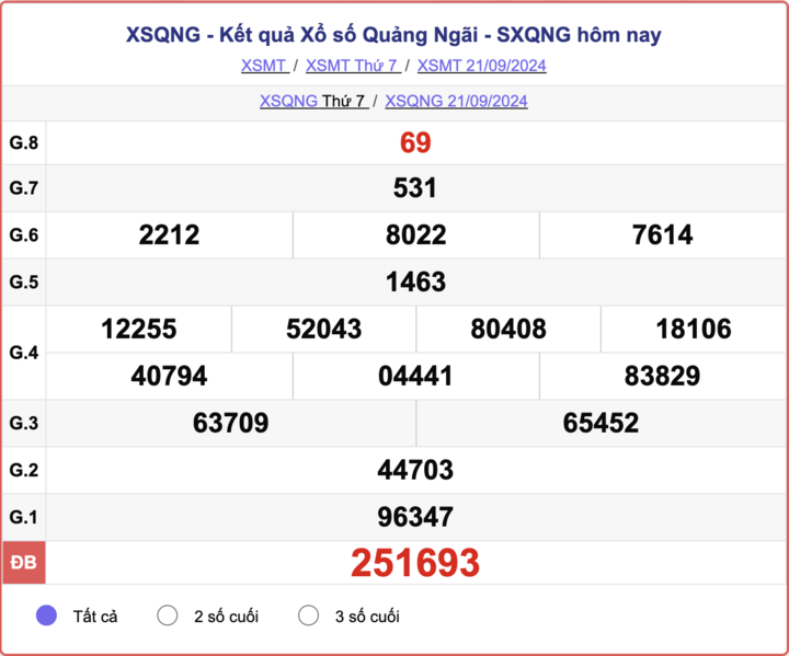 XSQNG 28/09. Kết quả xổ số Quảng Ngãi hôm nay - XSQNG thứ Bảy ngày 28/09/2024 sẽ được cập nhật nhanh chóng và chính xác nhất trên phuongtruongan.vn. Kết quả các giải thưởng XSQNG ngày 28/09/2024 sẽ được cập nhật liên tục từ giải nhất cho đến giải tám, cuối cùng là giải đặc biệt.