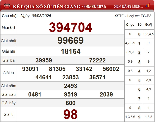 Theo dõi kết quả xổ số Tiền Giang hôm nay 8/3/2026 để cập nhật kết quả sớm nhất