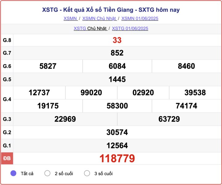 XSTG 8/6, Kết quả xổ số hôm nay ngày 8/6, XSTG Chủ nhật, Trực tiếp KQXSTG ngày 8/6, Kết quả xổ số Tiền Giang hôm nay ngày 8/6/2025.