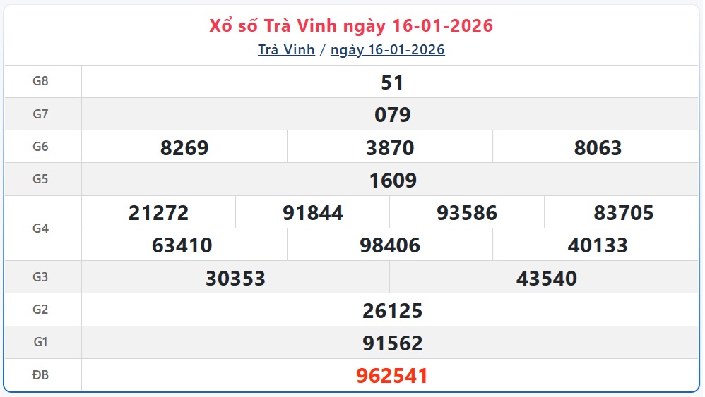 Theo dõi kết quả xổ số Trà Vinh hôm nay 16/1/2026 nhanh chóng và chính xác nhất để không bỏ lỡ thời gian nhận thưởng.