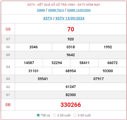 XSTV- XSTV - Xổ số Trà Vinh thứ Sáu ngày 13/09/2024