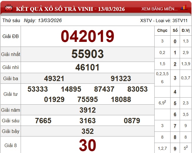 Kết quả Xổ số Trà Vinh ngày 13/3/2026