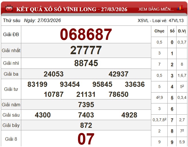 Kết quả xổ số Vĩnh Long Thứ Sáu ngày 27/3/2026