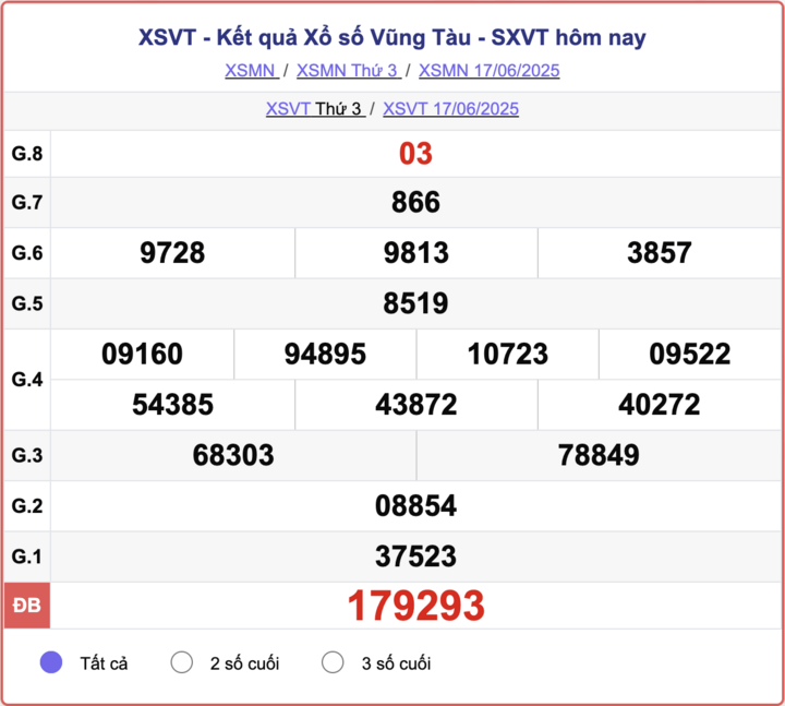 Trực tiếp Kết quả xổ số Vũng Tàu hôm nay - Kết quả XSVT 158/7 - XSVT hôm nay Thứ Ba ngày 15/7/2025