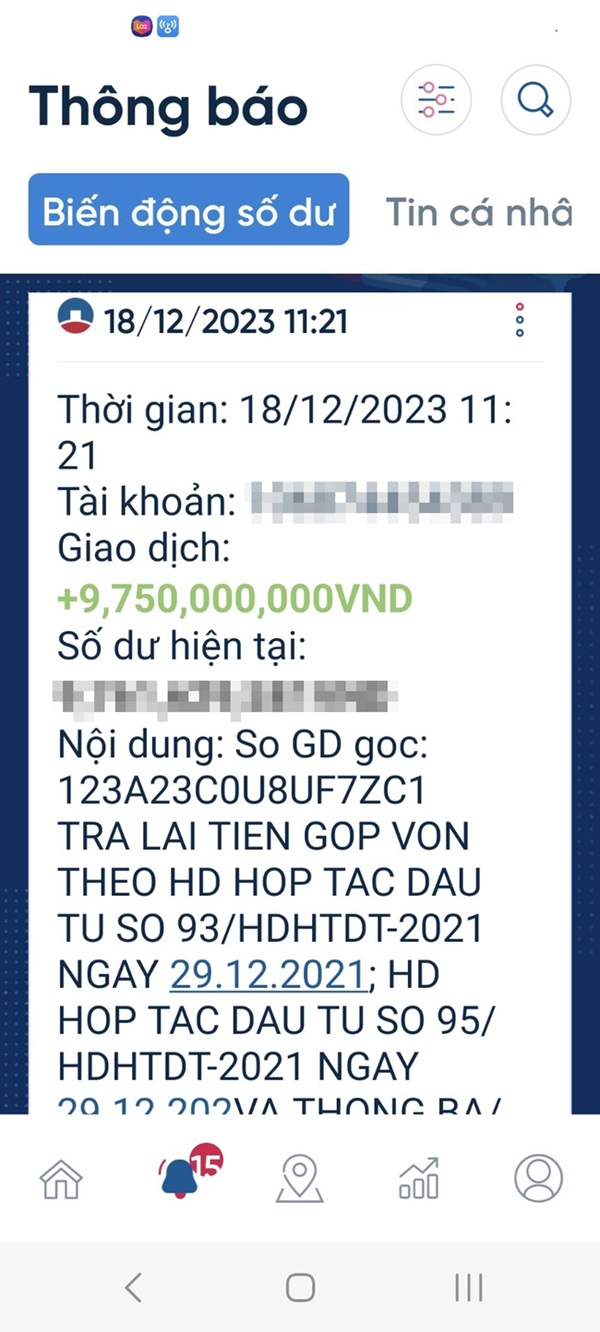 Theo đó, tài khoản của ông N.H.L bất ngờ nhận được số tiền 9,75 tỷ đồng với nội dung trả lại tiền góp vốn theo hợp đồng hợp tác đầu tư của Công ty TNHH Xây dựng công trình Hoàng Hà.