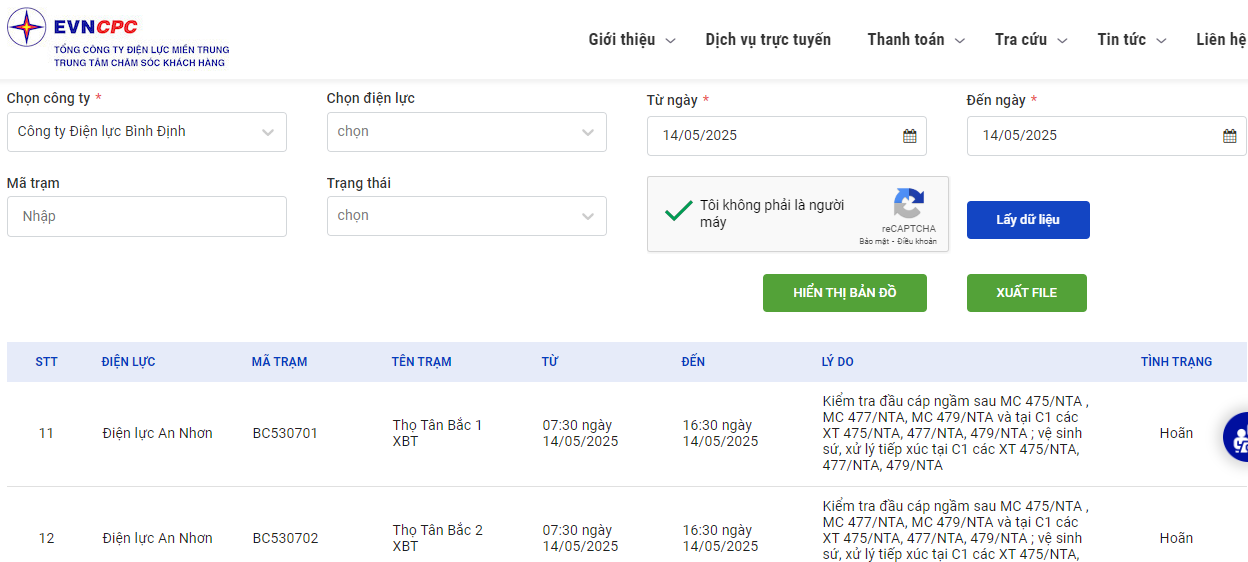 | Điện lực An Nhơn | BC530712 | Bò Sữa Nhơn Tân 2 | 07:30 14/05/2025 | 16:30 14/05/2025 | Kiểm tra đầu cáp ngầm sau MC 475/NTA , MC 477/NTA, MC 479/NTA và tại C1 các XT 475/NTA, 477/NTA, 479/NTA ; vệ sinh sứ, xử lý tiếp xúc tại C1 các XT 475/NTA, 477/NTA, 479/NTA | Hoãn |