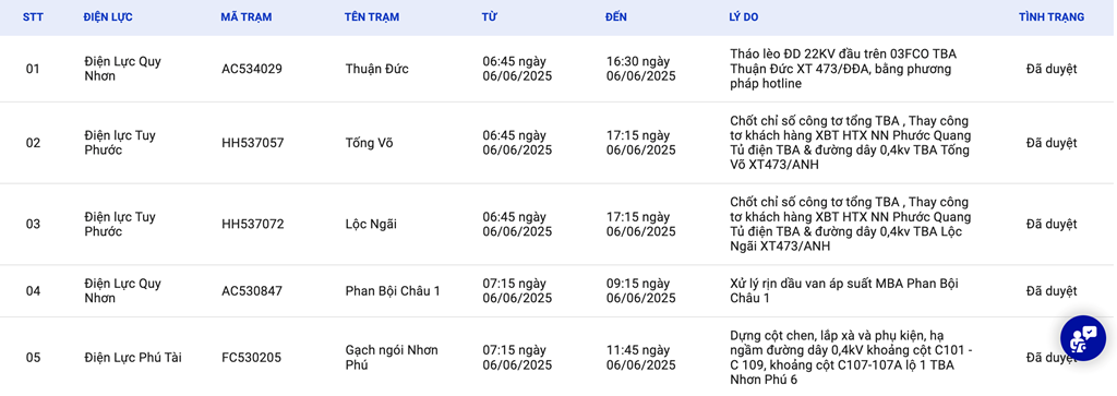 | 8 | Điện Lực Quy Nhơn | AC530842 | Phan Bội Châu 2 | 09:45 06/06/2025 | 11:15 06/06/2025 | Xử lý rịn dầu nấc phân áp MBA Phan Bội Châu 2 | Đã duyệt |
