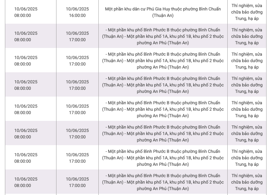 | 10/06/2025 8:00:00 | 10/06/2025 17:00:00 | - Một phần khu phố Bình Phước B thuộc phường Bình Chuẩn (Thuận An) - Một phần khu phố 1A, khu phố 1B, khu phố 2 thuộc phường An Phú (Thuận An) | Thí nghiệm, sửa chữa bảo dưỡng Trung, hạ áp |