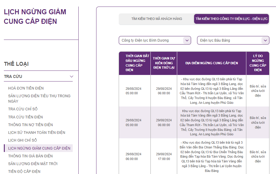 29/08/2024 05:00:00 29/08/2024 06:00:00 Khu vực dọc đường QL13 bên phài từ Tạp hóa bà Tám Vàng đến ngã 3 Bằng Lang, dọc 02 bên đường QL13 từ ngả 3 Bằng Lăng đến Cầu Tham Rớt - Thị trấn Lai Uyên, xã Trừ Văn Thố, Cây Trường II huyện Bàu Bàng; xã Tân Long, An Long huyện Phú Giáo Bảo trì, sửa chữa lưới điện