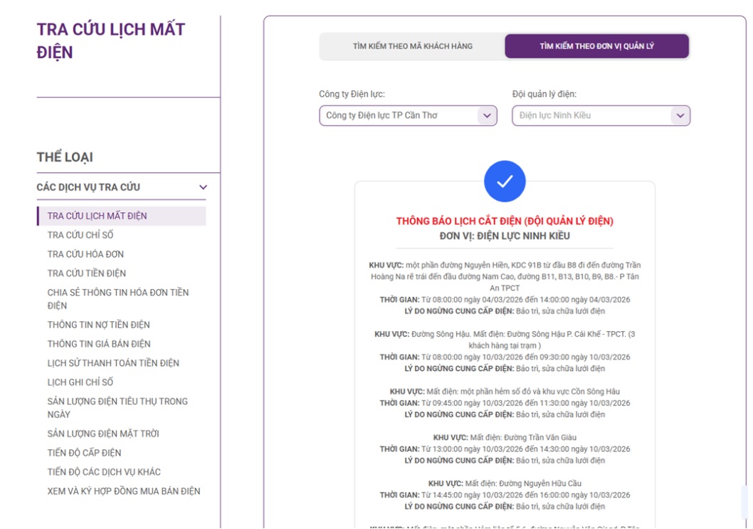 Lịch cắt điện tại các khu vực trên địa bàn Cần Thơ ngày 10/3/2026 được cập nhật tại website của Tổng công ty Điện lực miền Nam (EVNSPC).
