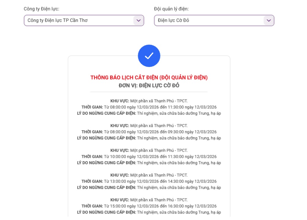 Lịch cắt điện tại các khu vực trên địa bàn Cần Thơ ngày 12/3/2026 được cập nhật tại website của Tổng công ty Điện lực miền Nam (EVNSPC).
