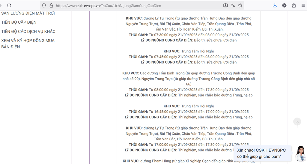 Lịch cắt điện tại các quận, huyện trên địa bàn Cần Thơ ngày 21/9/2025 được cập nhật tại website của Tổng công ty Điện lực miền Nam (EVNSPC).