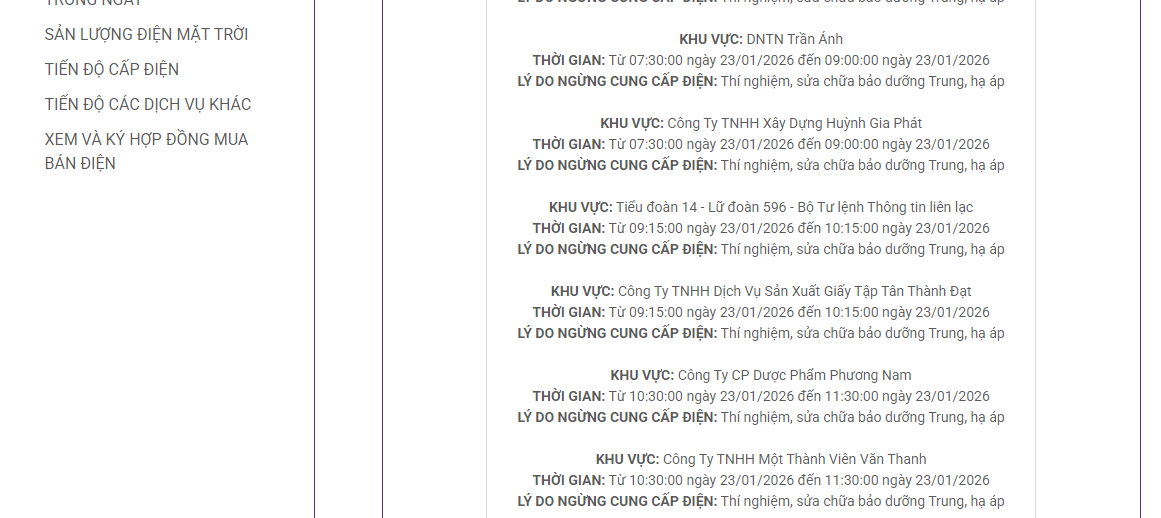 Lịch cắt điện tại các khu vực trên địa bàn Cần Thơ ngày 23/1/2026 được cập nhật tại website của Tổng công ty Điện lực miền Nam (EVNSPC).