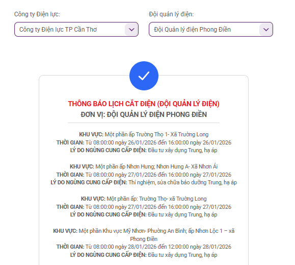 Lịch cắt điện tại các xã, phường trên địa bàn Cần Thơ ngày 26/1/2026 được cập nhật tại website của Tổng công ty Điện lực miền Nam (EVNSPC).