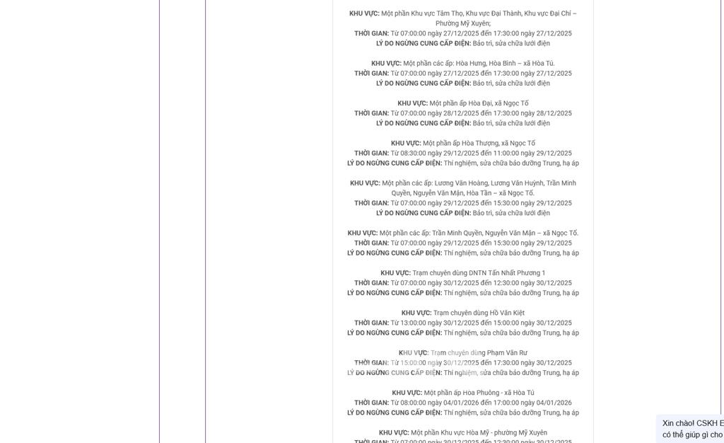 Công ty Điện lực thành phố Cần Thơ thông báo lịch cắt điện ngày 27/12/2025 tại các xã, phường trên địa bàn thành phố Cần Thơ trên website của Tổng Công ty Điện lực miền Nam như sau.