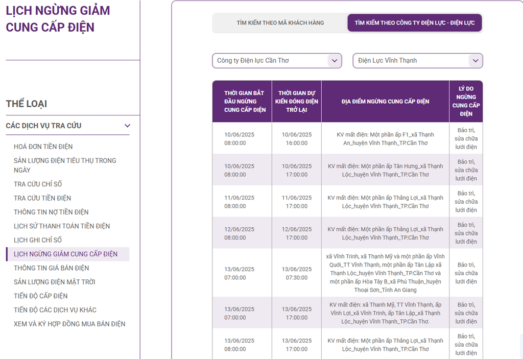 Lịch ngừng cấp điện trên địa bàn Cần Thơ ngày mai 11/6/2025 được cập nhật tại website của EVNSPC.