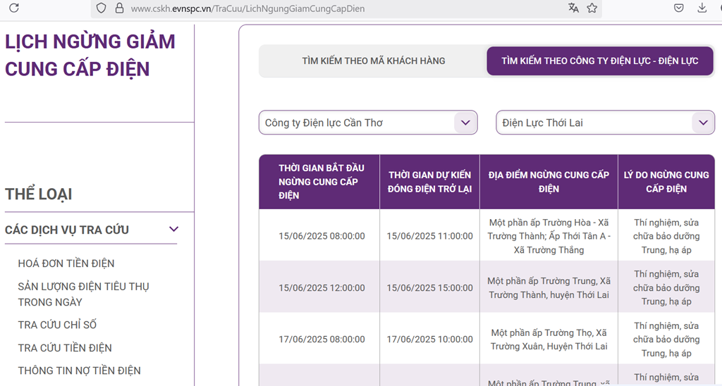 Thông tin Lịch cắt điện tại các quận, huyện trên địa bàn Cần Thơ ngày mai 15/6/2025 được cập nhật tại website của Tổng công ty Điện lực miền Nam (EVNSPC).