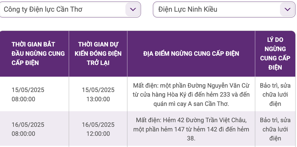 | 16/5/25 08:00 | 16/5/25 12:00 | Mất điện: Hẻm 42 Đường Trần Việt Châu, một phần hẻm 147 từ hẻm 142 đi đến hẻm 38. | Bảo trì, sửa chữa lưới điện |