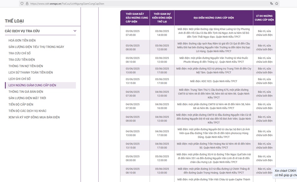 Lịch ngừng cấp điện tại Cần Thơ ngày mai 4/6 được cập nhật ngày 3/6 tại website của EVNSPC.