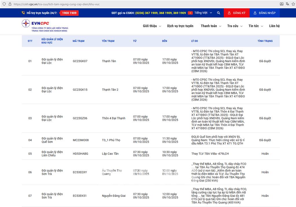 | 7 | Đội quản lý điện Sơn Trà | EC53EK51 | Nguyễn Đăng Giai | 07:30 09/10/2025 | 12:00 09/10/2025 | _Thay thế MBA, AB tổng, TI, dây chảy FCO, tăng cường cáp lực hạ áp từ MBA đến AB tổng ... tại TBA Nguyễn Đăng Giai đz 481 CTS (xử lý quá tải)