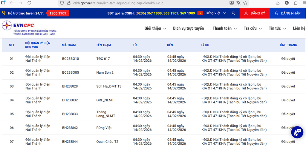Lịch cắt điện Đà Nẵng ngày 14/2/2026 cập nhật tại website của EVNCPC.
