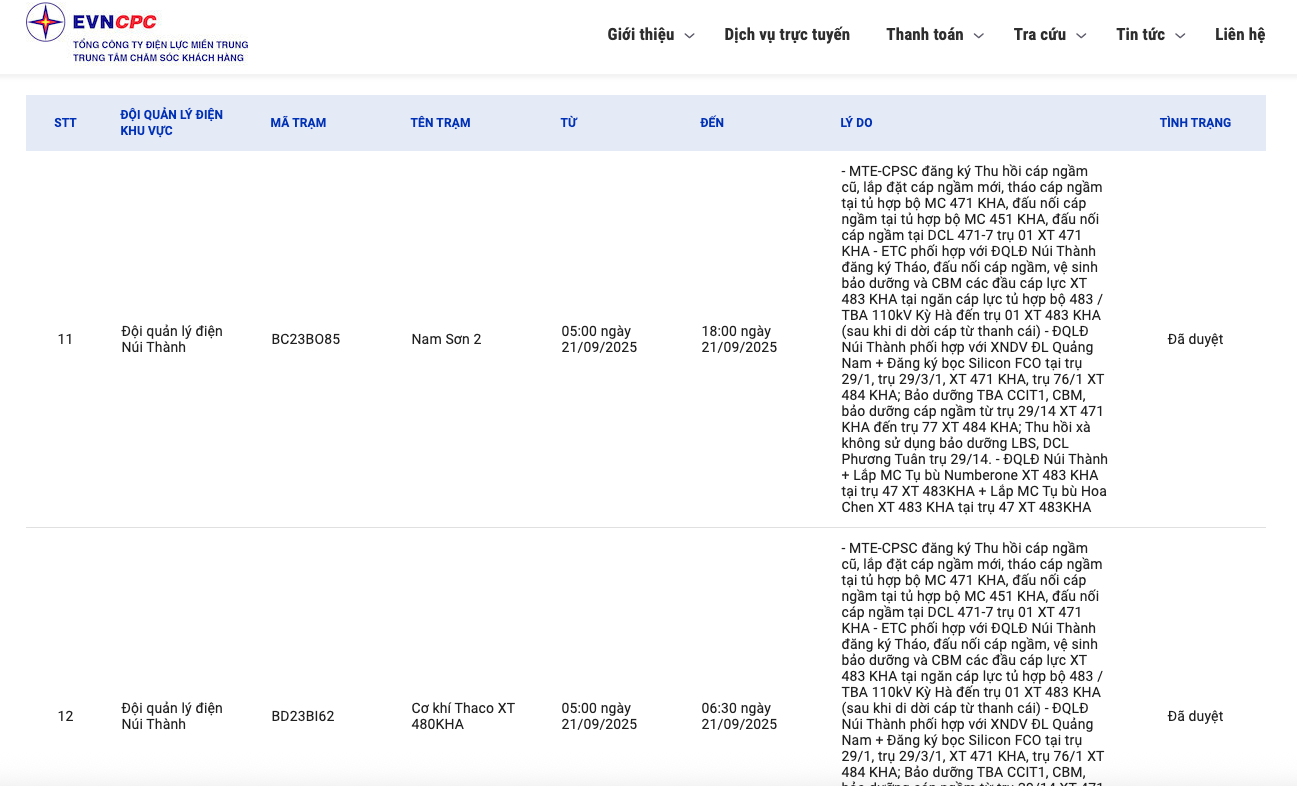 Lịch cắt điện cập nhật mới nhất của các xã tại Đà Nẵng ngày 21/9/2025. Lịch cúp điện Đà Nẵng. Lịch cúp điện Đà Nẵng ngày mai, Lịch cúp điện Đà Nẵng hôm nay.
