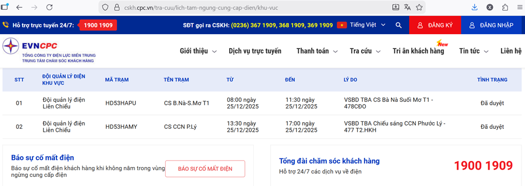 Tổng công ty Điện lực miền Trung (EVNCPC) thông báo lịch tạm ngừng cung cấp điện (lịch cúp điện Đà Nẵng) ngày 25/12 cập nhật mới nhất như sau: