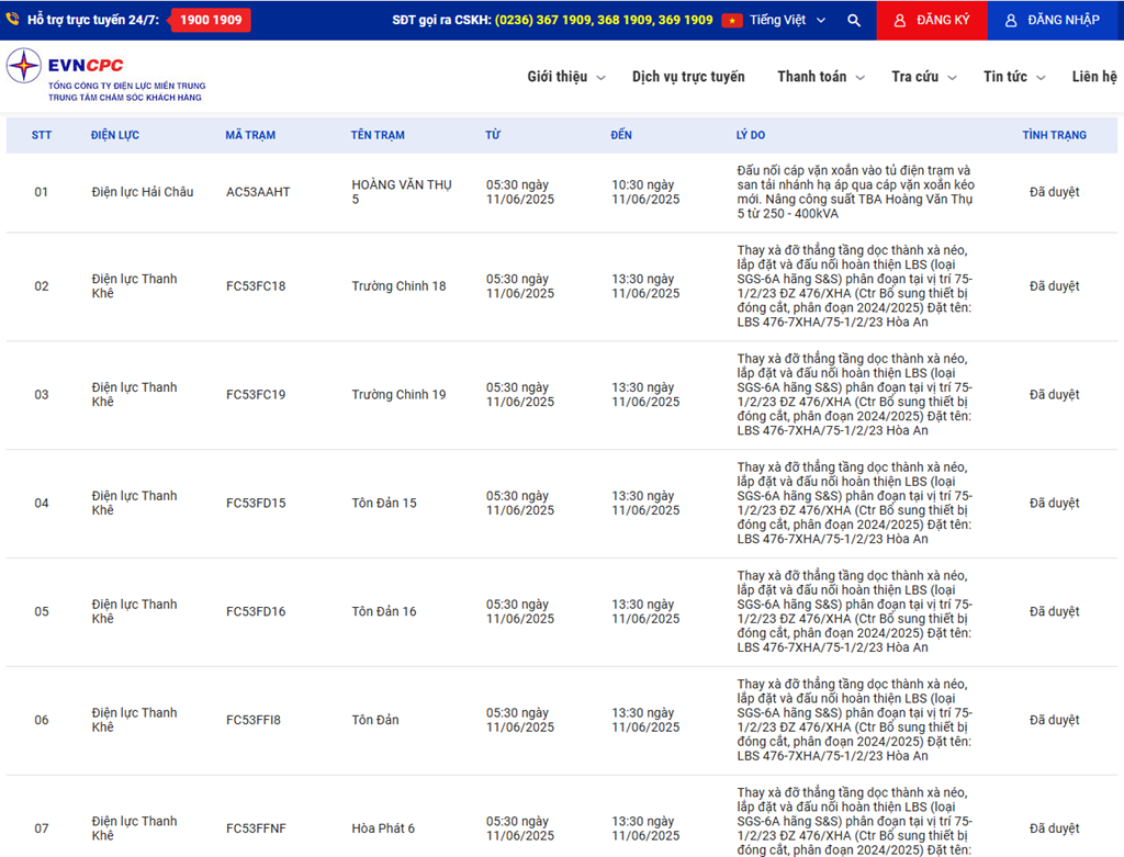 | 3 | Điện lực Thanh Khê | FC53FC19 | Trường Chinh 19 | 05:30 11/06/2025 | 13:30 11/06/2025 | Thay xà đỡ thẳng tầng dọc thành xà néo, lắp đặt và đấu nối hoàn thiện LBS (loại SGS-6A hãng S&S) phân đoạn tại vị trí 75-1/2/23 ĐZ 476/XHA (Ctr Bổ sung thiết bị đóng cắt, phân đoạn 2024/2025)