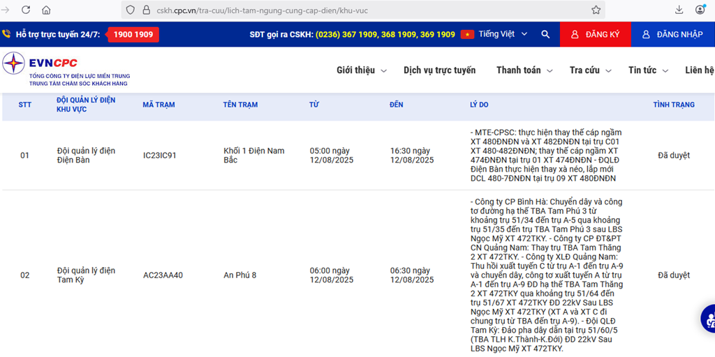 | Đội quản lý điện Điện Bàn | IC23IC91 | Khối 1 Điện Nam Bắc | 05:00 12/08/2025 | 16:30 12/08/2025 | - MTE-CPSC: thực hiện thay thế cáp ngầm XT 480ĐNĐN và XT 482ĐNĐN tại trụ C01 XT 480-482ĐNĐN; thay thế cáp ngầm XT 474ĐNĐN tại trụ 01 XT 474ĐNĐN