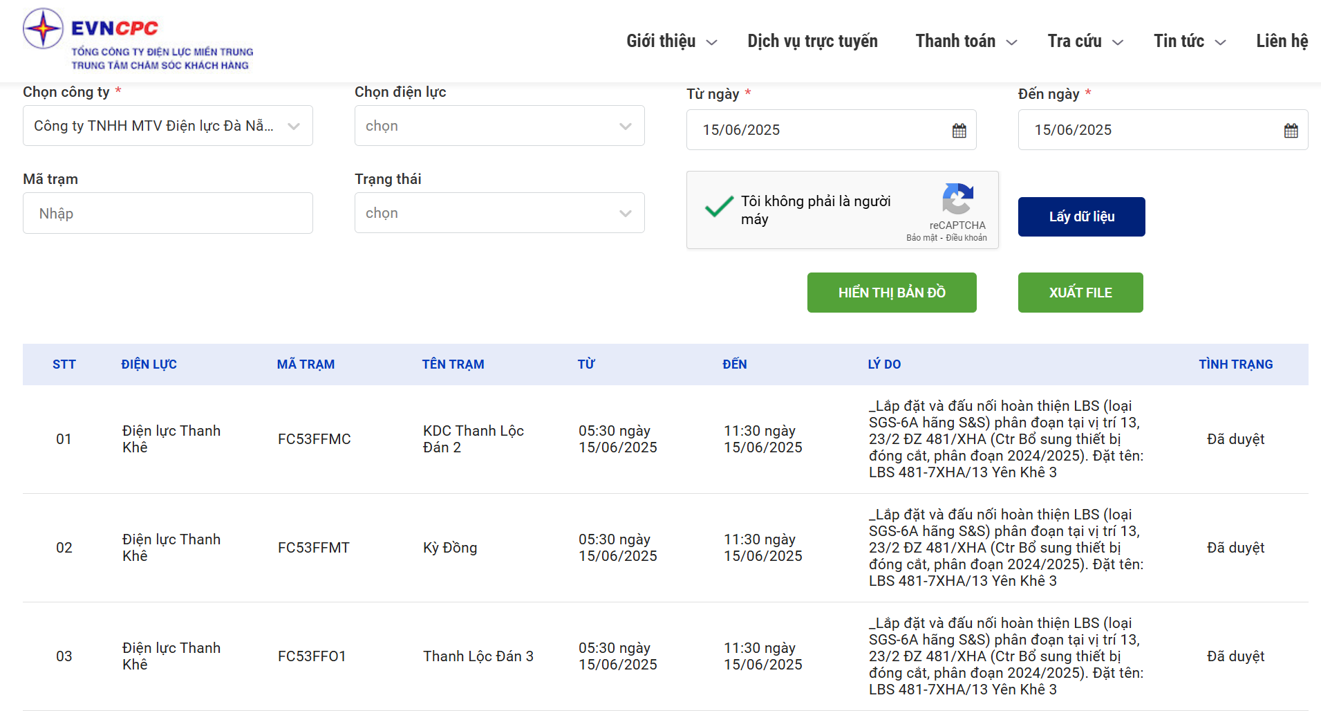 | Điện lực Thanh Khê | FC53FBP7 | Điện Biên Phủ 7 | 06:30 15/06/2025 | 12:30 15/06/2025 | Xử lý các tồn tại sau nghiệm thu hạ ngầm khoảng trụ C3-C6 mạch kép ĐZ 472 - 474/XHA.(Theo đề nghị của UBND Quận Thanh Khê) | Đã duyệt |