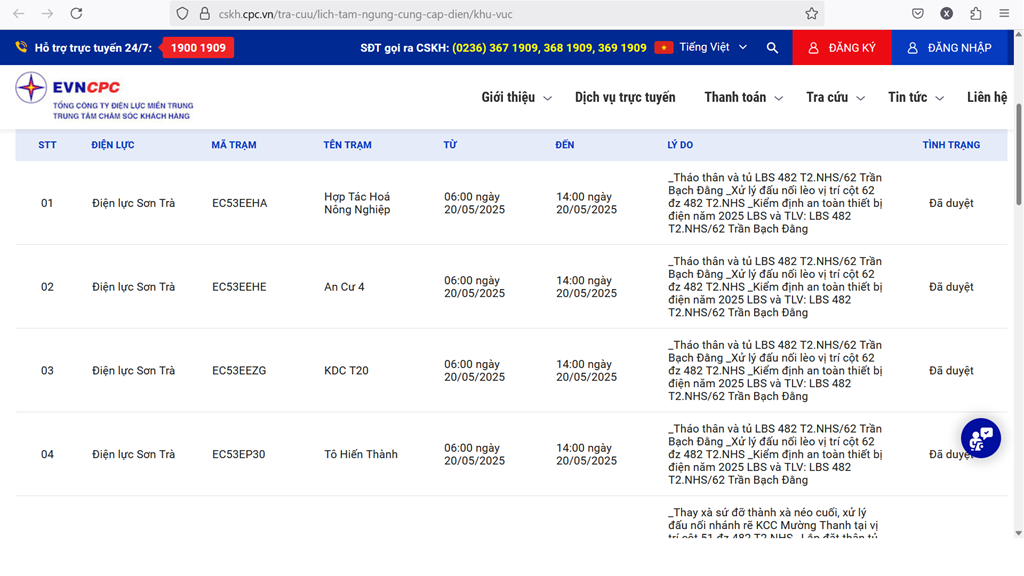 Lịch cắt điện Đà Nẵng ngày 20/5 cập nhật tại website của EVNCPC.