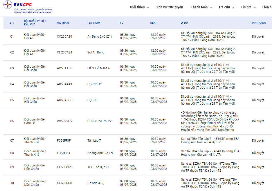 | 10 | Đội quản lý điện Liên Chiểu | HC53HO31 | Đà Sơn 4T2 | 07:00 03/07/2025 | 10:30 03/07/2025 | Sang tải ĐZHA TBA Đà Sơn 4T2 qua TBA TĐC TDTT - 478CĐO. Thay TI định kỳ Công An TP thuộc TBA Đà Sơn 4T2 | Đã duyệt |