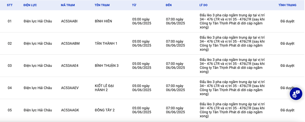 | 9 | Điện lực Hải Châu | AD53A3DC | HỘ HỒ SỸ NAM | 05:00 06/06/2025 | 07:00 06/06/2025 | Đấu lèo 3 pha cáp ngầm trung áp tại vị trí 34– 476 LTR và vị trí 35 - 476LTR (sau khi Công ty Tân Thịnh Phát di dời cáp ngầm xong) | Đã duyệt |