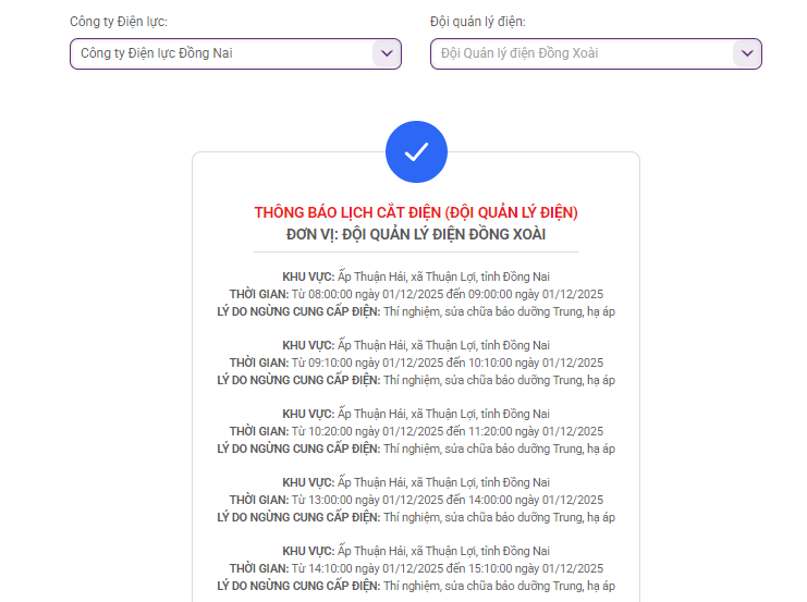 Thông tin về lịch cắt điện cập nhật mới nhất tại các xã, phường tỉnh Đồng Nai ngày 1/12/2025 cập nhật mới nhất.