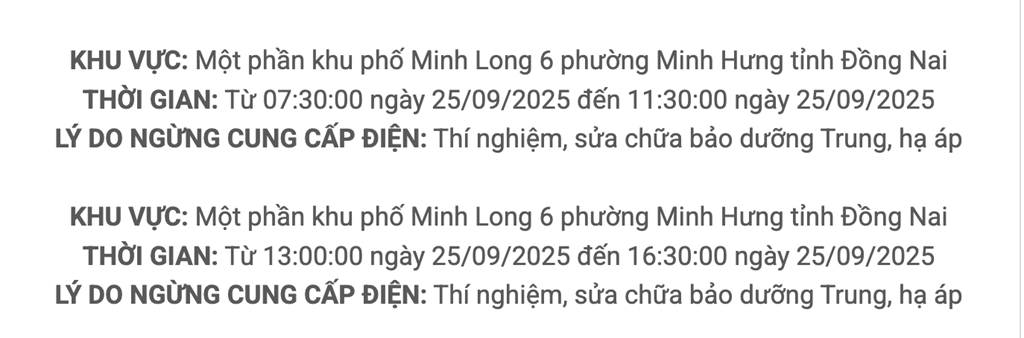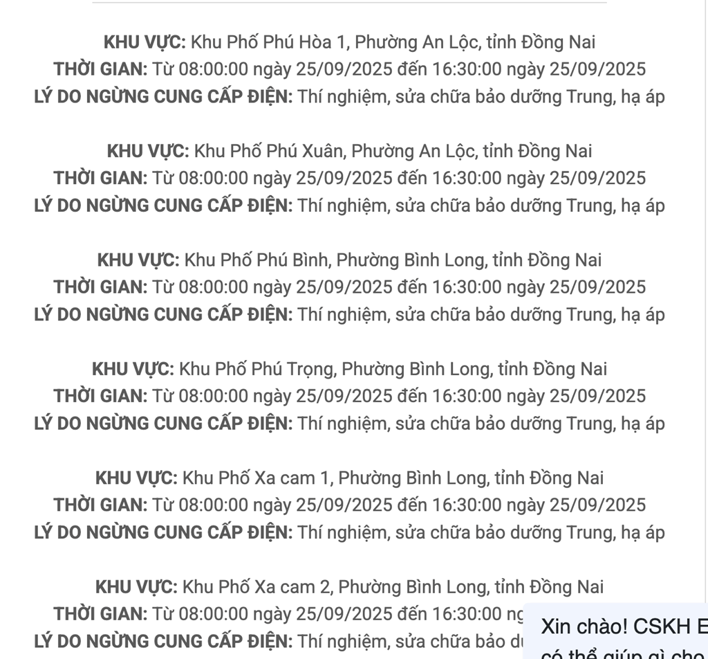 Lịch cắt điện (lịch tạm ngừng cấp điện mới nhất) cập nhật mới nhất tại các phường (thành phố Biên Hòa), xã (Đồng Nai) ngày 25/9/2025 cập nhật mới nhất.
