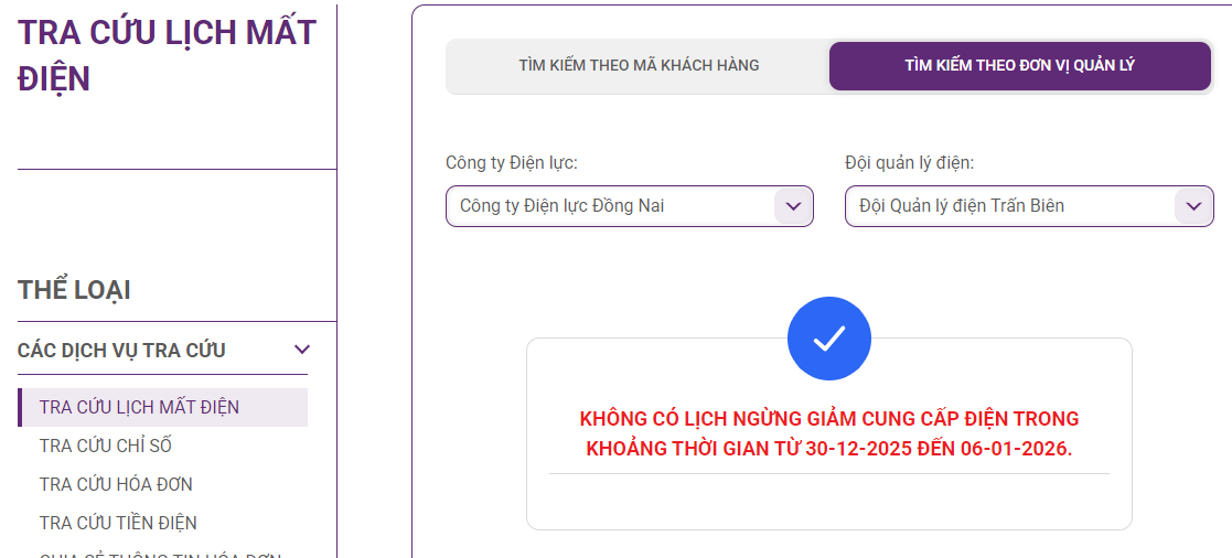 Lịch cắt điện (lịch tạm ngừng cấp điện mới nhất) cập nhật mới nhất tại Biên Hòa, lịch cắt điện tại Đồng Nai ngày 31/12/2025.