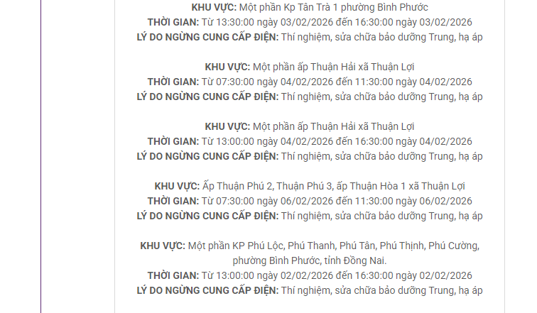 Lịch cắt điện (lịch tạm ngừng cấp điện mới nhất) cập nhật mới nhất tại các phường (thành phố Biên Hòa), xã (Đồng Nai) ngày 6/2/2026 cập nhật mới nhất.