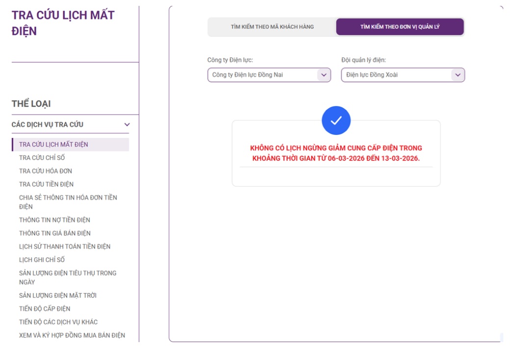 Cập nhật mới nhất lịch cắt điện cụ thể tại Đồng Nai từ website của Tổng công ty Điện lực miền Nam (EVNSPC), Công ty TNHH MTV Điện lực Đồng Nai vào ngày 7/3/2026.