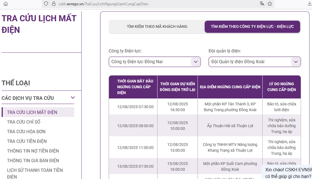 | Phước Long | 12/08/2025 07:30:00 | 12/08/2025 15:00:00 | TBA Huỳnh Ngọc Vân Phường Phước Bình tỉnh Đồng Nai. | Thí nghiệm, sửa chữa bảo dưỡng Trung, hạ áp |