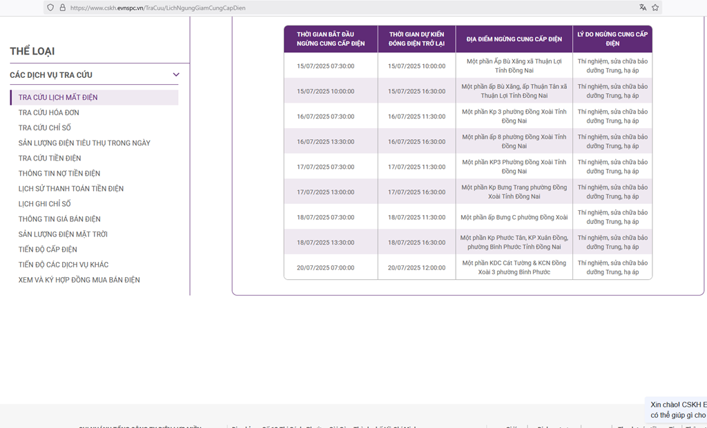 | 16/07/2025 07:30:00 | 16/07/2025 16:30:00 | Một phần thôn 1, xã Bình Tân, tỉnh Đồng Nai | Thí nghiệm, sửa chữa bảo dưỡng Trung, hạ áp |