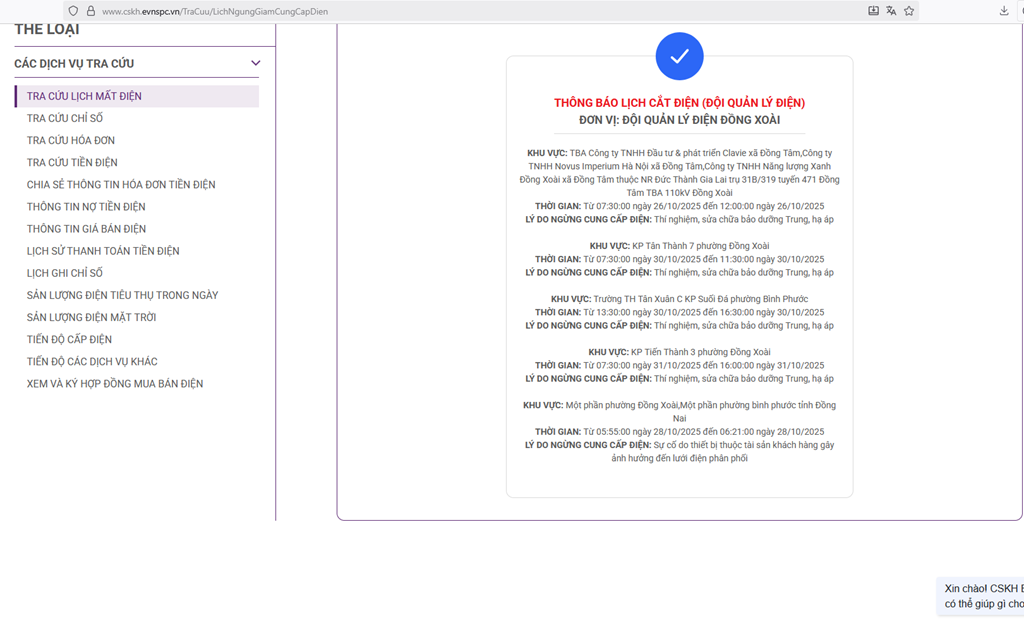 Cập nhật mới nhất lịch cắt điện cụ thể tại Đồng Nai từ website của Tổng công ty Điện lực miền Nam (EVNSPC), Công ty TNHH MTV Điện lực Đồng Nai vào ngày mai 31/10/2025.