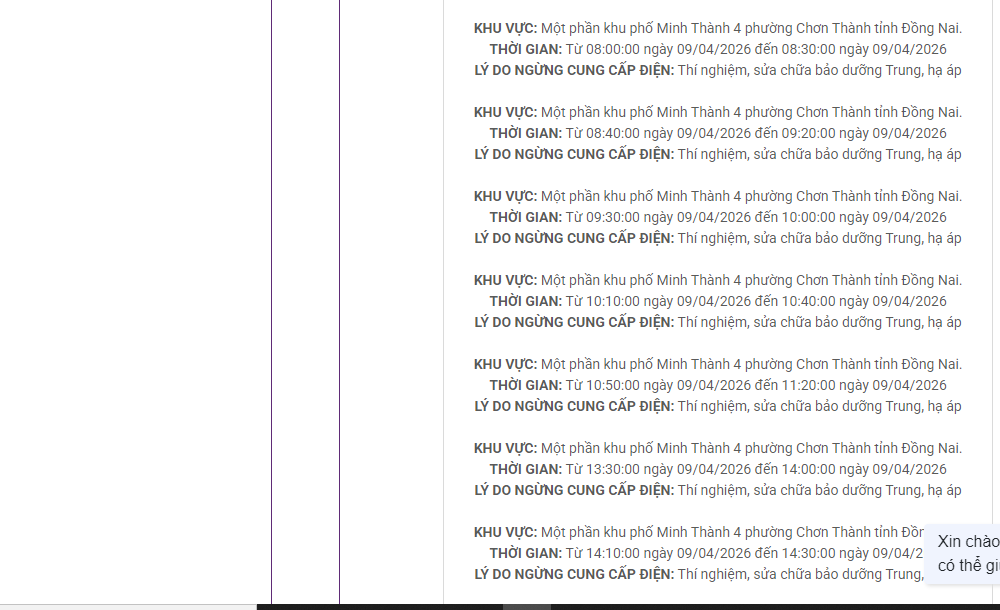 Cập nhật mới nhất lịch cắt điện cụ thể tại Đồng Nai từ website của Tổng công ty Điện lực miền Nam (EVNSPC), Công ty TNHH MTV Điện lực Đồng Nai vào ngày mai 9/4/2026.