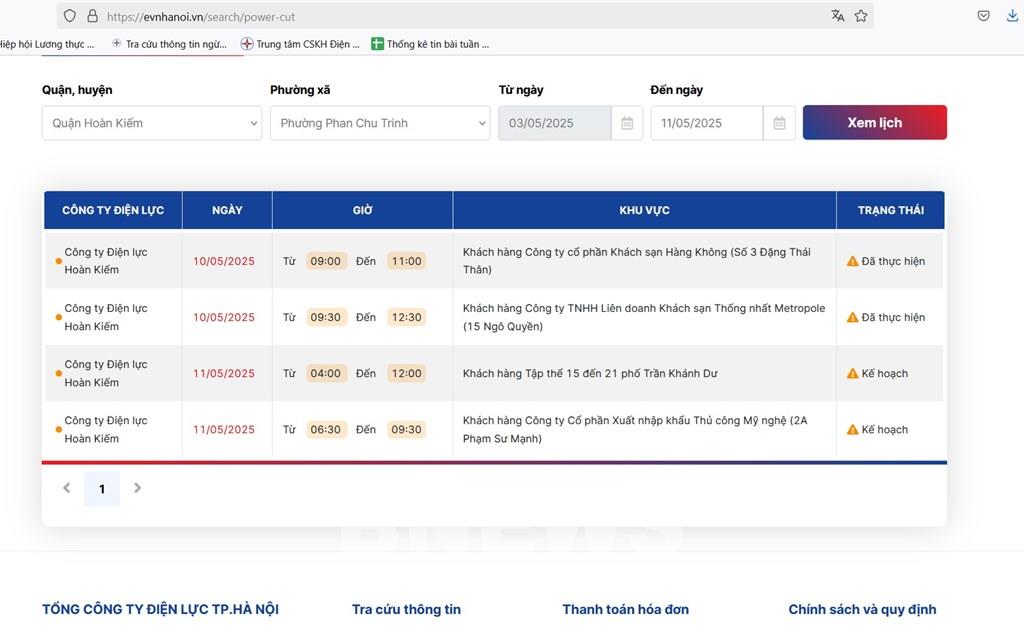 Tổng công ty Điện lực TP Hà Nội thông báo lịch cắt điện Hà Nội tại các quận, huyện ngày 11/5 tại https://evnhanoi.vn/search/power-cut.