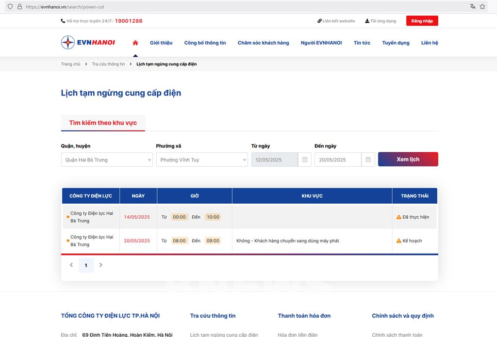 Tổng công ty Điện lực TP Hà Nội thông báo lịch cắt điện Hà Nội tại các quận, huyện ngày 20/5 tại https://evnhanoi.vn/search/power-cut.