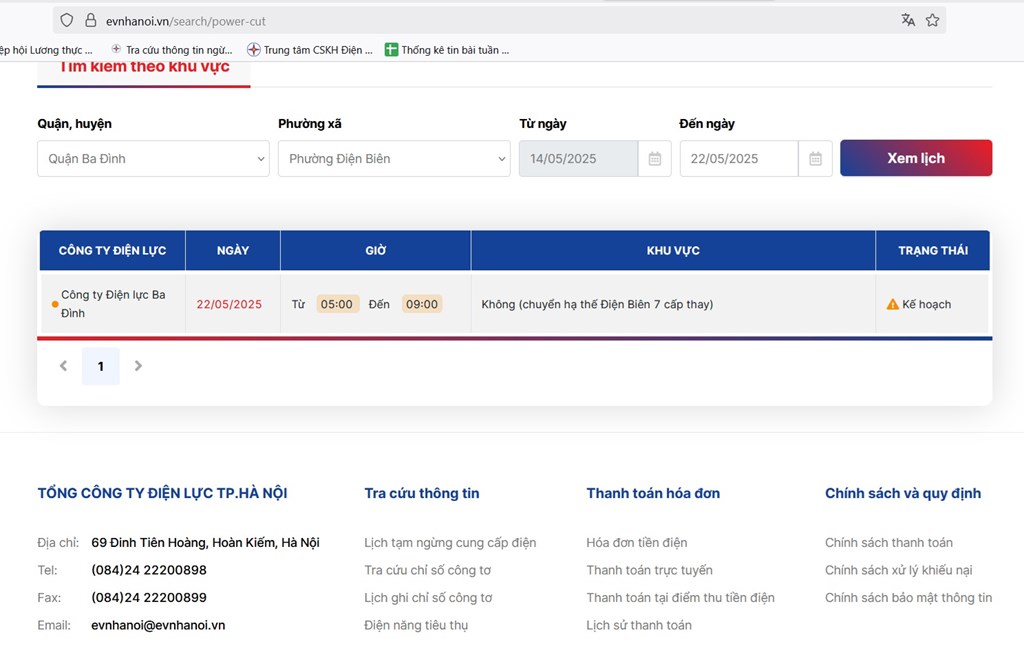 Tổng công ty Điện lực TP Hà Nội thông báo lịch cắt điện Hà Nội tại các quận, huyện ngày 22/5 tại https://evnhanoi.vn/search/power-cut.