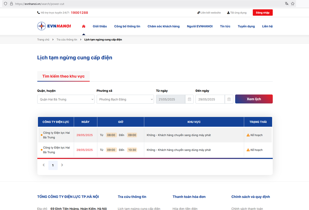Tổng công ty Điện lực TP Hà Nội thông báo lịch cắt điện Hà Nội tại các quận, huyện ngày 29/5 tại https://evnhanoi.vn/search/power-cut.